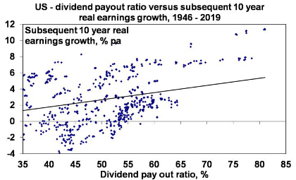 First, dividends do matter in terms of returns from shares. For the US share market, it has been found that higher dividend payouts lead to higher earnings growth1. This is illustrated in the next chart, which shows that for the period since 1946 when US companies paid out a high proportion of earnings as dividends (the horizontal axis) this has tended to be associated with higher growth in profits (after inflation) over the subsequent 10 years (vertical axis). And higher profit growth drives higher returns from shares. So dividends do matter and the higher the better (within reason). There are several reasons why this is the case: when companies retain a high proportion of earnings there is a tendency for poor hubris driven investments; high dividend payouts are indicative of corporate confidence about future earnings; and high payouts indicate earnings are real.
