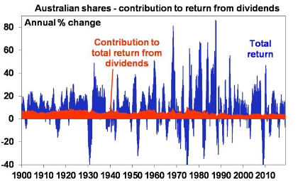 Second, dividends provide a stable contribution to the total return from shares, compared to the year-to-year volatility in capital gains. Of the 11.7% pa total return from Australian shares since 1900, just over half has been from dividends.