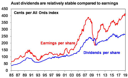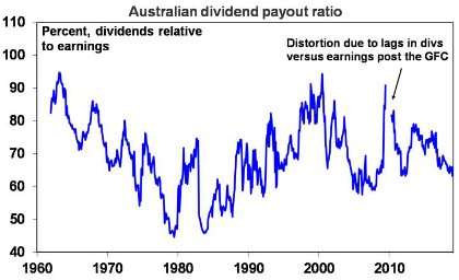Australian companies pay out a high proportion of earnings as dividends. This is currently around 65% compared to around 45% for global shares. However, some argue that dividends don’t matter – as investors should be indifferent as to whether a company pays a dividend or retains earnings that are reinvested to drive growth. Or worse still, some argue that high dividend pay outs are a sign of poor long-term growth prospects, that they are distraction from business investment or that they are often not sustainable. And of course, some just see dividends as boring relative to speculating on moves in share values. My assessment is far more favourable.