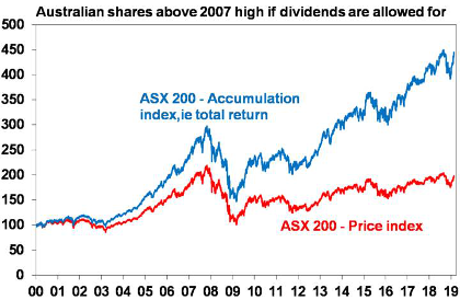 Finally, while Australian shares are still 10% below their 2007 high, once reinvested dividends are allowed for (ie looking at the ASX 200 accumulation index) the market is well above it.