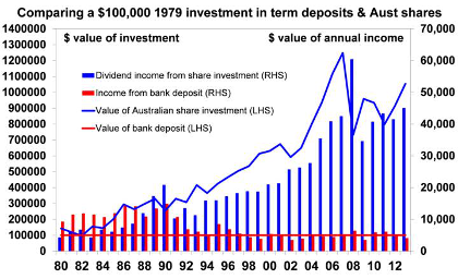 How powerful investing for dividend income can be relative to investing for income from interest is illustrated in the next chart. It compares initial $100,000 investments in Australian shares and one-year term deposits in December 1979.